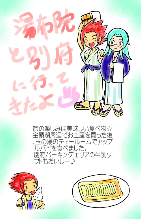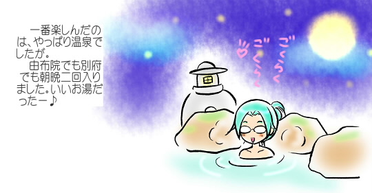旅館に行く前に、兄の勧めで地獄巡り。見るのは初めてなので面白かったです。自然の不思議に感動。爬虫類萌えの私は鬼山地獄の仔ワニに大喜び。可愛い!